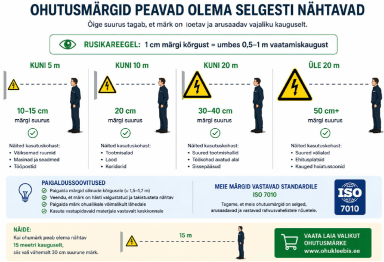 Kui suured peavad ohutusmärgid olema ja kui kaugelt peavad need nähtavad olema?